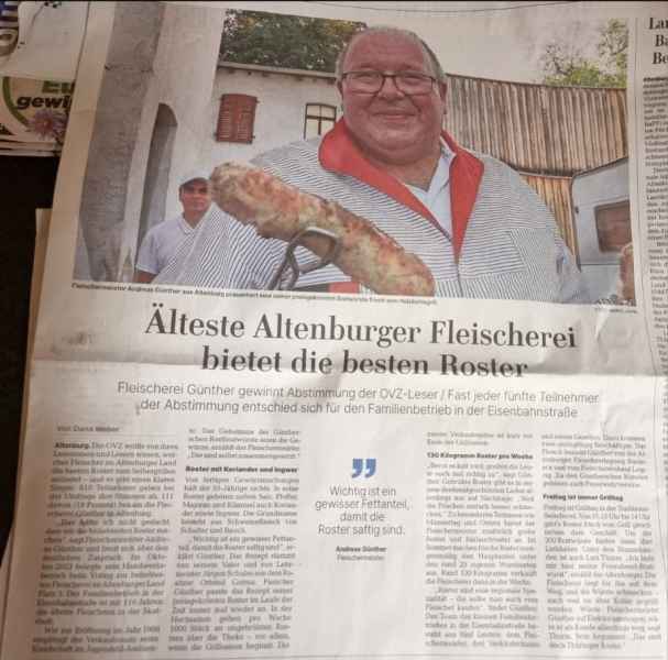 Mit großer Freude haben wir erfahren, dass die älteste Fleischerei Altenburgs bei der Umfrage der OVZ-Leser mit ihren preisgekrönten Rostbratwürsten den ersten Platz belegt hat. Dieser Erfolg zeigt einmal mehr, dass echte Handwerkskunst, Tradition und Leidenschaft unübertrefflich sind!