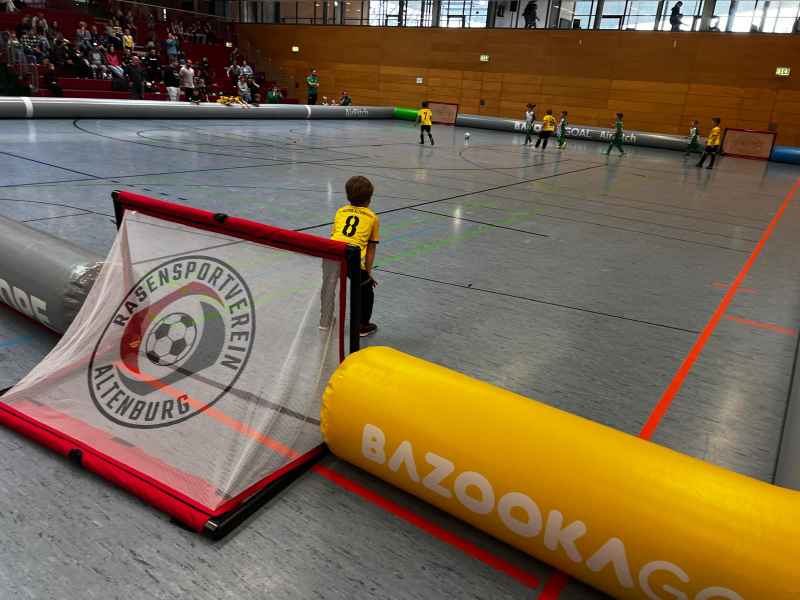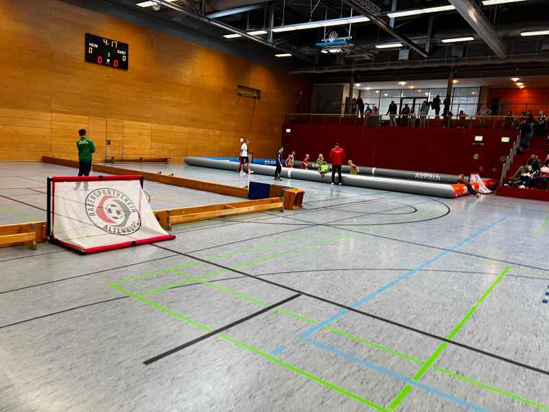 Über die gesamte Hallenfläche verteilt entstanden eine große und eine kleine Fußball-Arena sowie ein weiteres abgetrenntes Spielfeld. Drei Felder, gleichzeitig in Betrieb, sorgten für durchgehend Action. Gespielt wurde jeweils 5 Minuten pro Partie: kurz, intensiv und voller Energie 💥⚽
